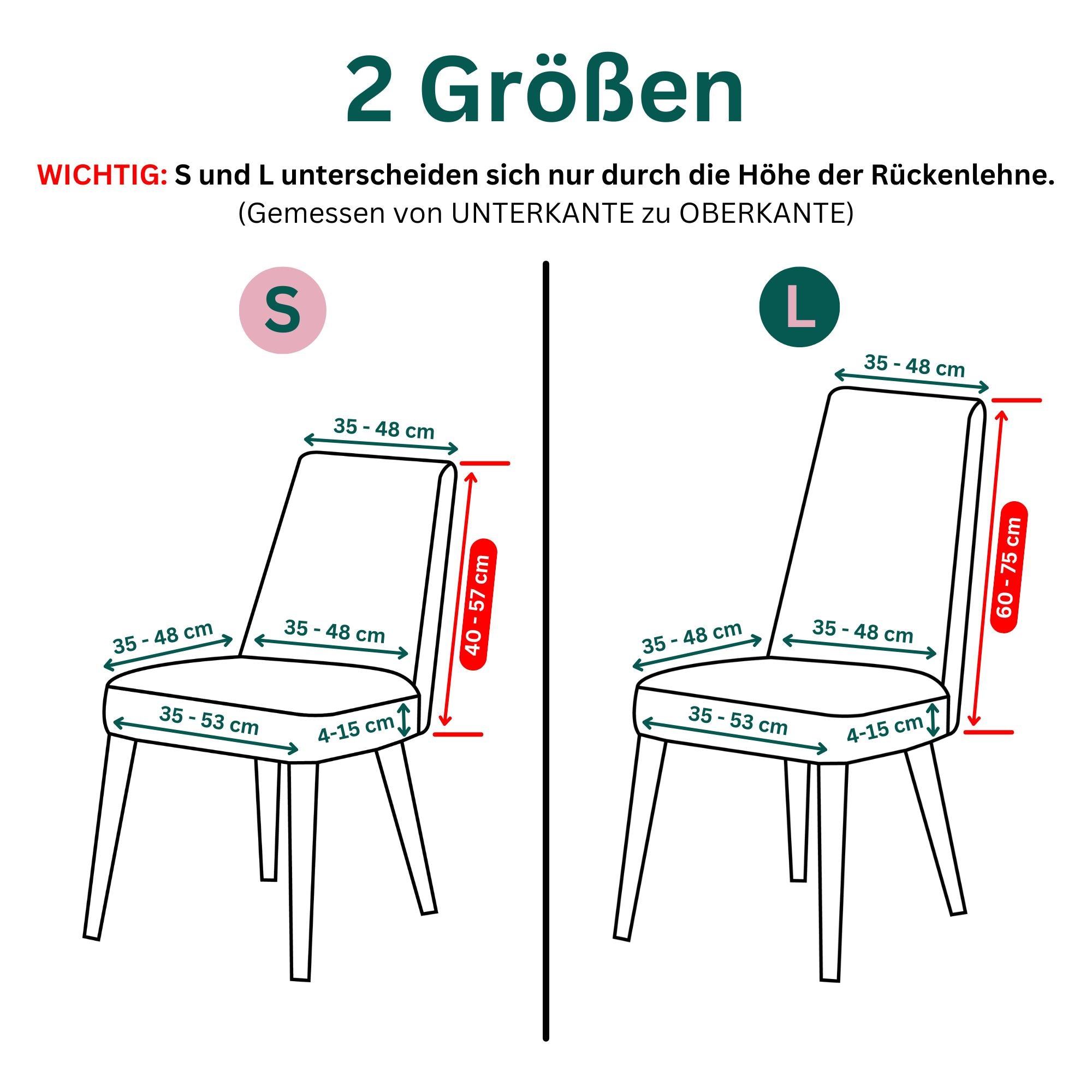 Die Größen L & S unterscheiden sich lediglich in der Höhe der Rückenlehne. Bitte messen sie von Unterkante Sitzfläche/Rückenlehne bis Oberkante Rückenlehne (Siehe Videoanleitung)