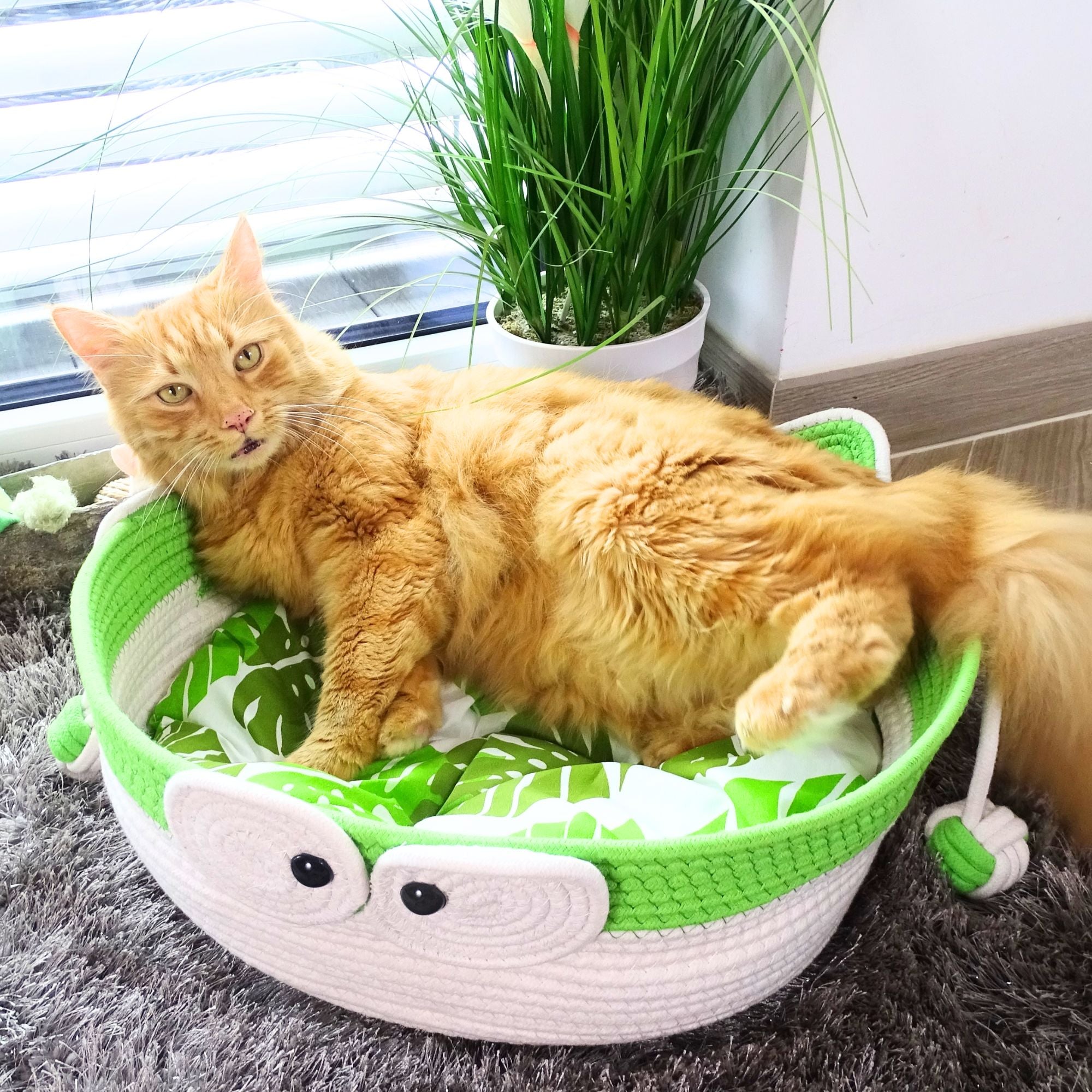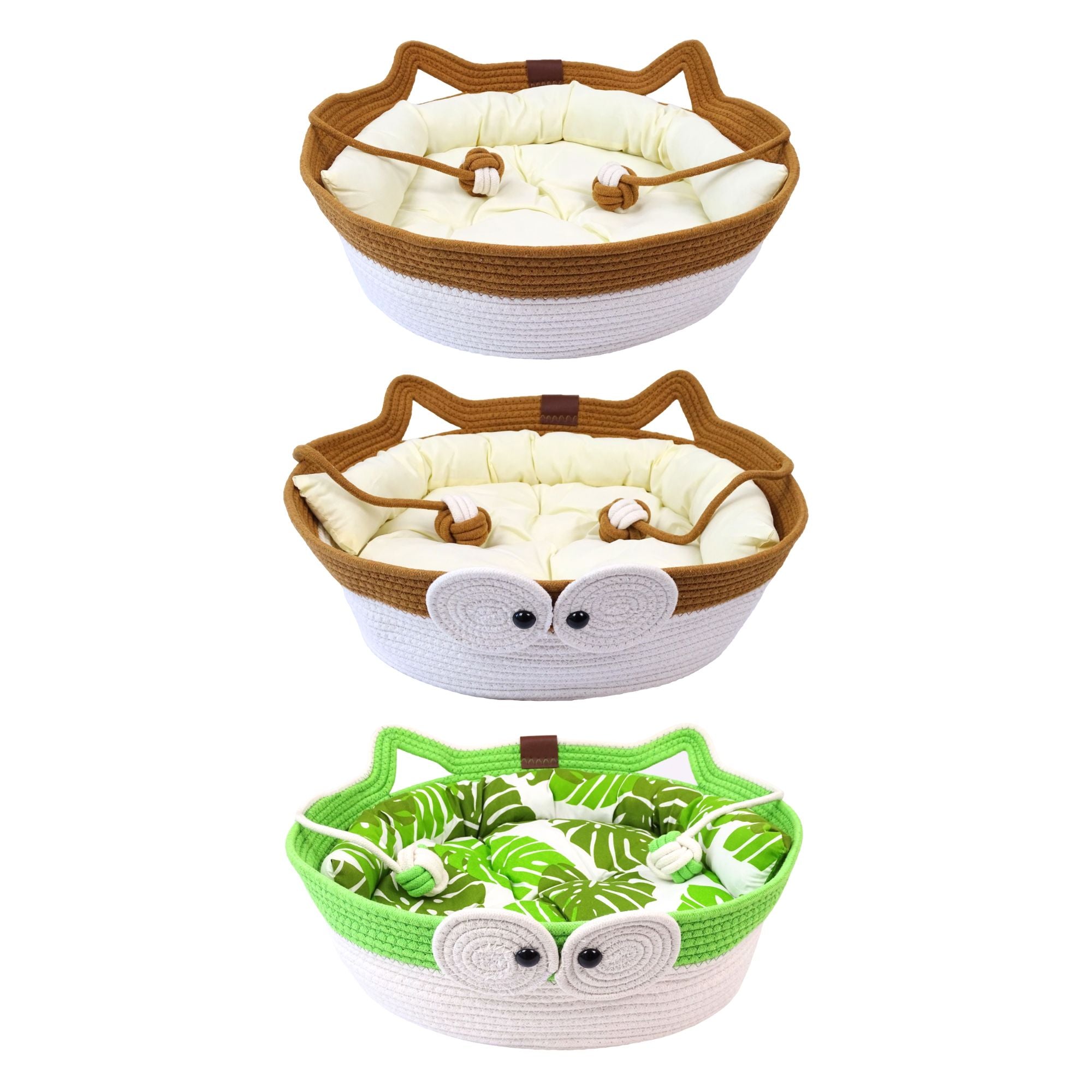 Das Katzenbett ist in den Farben Grün und Beige erhältlich und kann wahlweise mit oder ohne niedliche Augen gewählt werden. Es kombiniert stilvolles Design mit gemütlichem Komfort und ist damit ein echter Hingucker für jedes Zuhause.