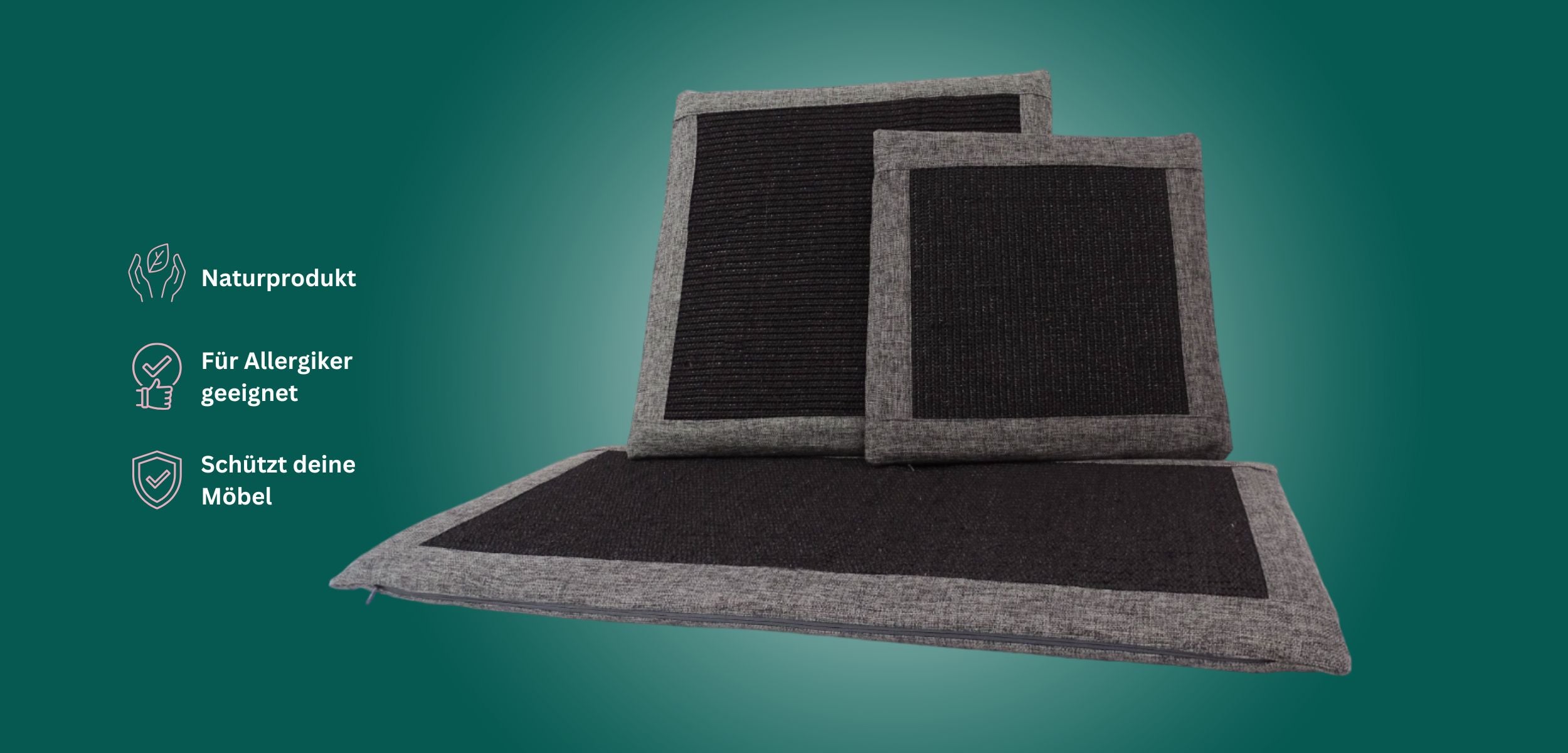 Unsere Premium Kratzkissen mit Sisal-Kratzmatte passen perfekt für dein Sofa oder deine Eckbank. Deine Möbel werden geschützt, deine Katze stillt ihr Kratzverlangen und pflegt gleichzeitig ihre Krallen.
