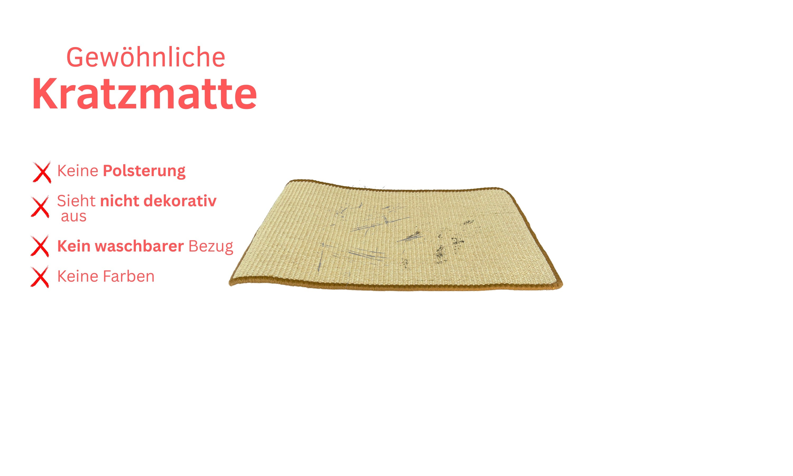 Im Gegensatz zu herkömmlichen, flachen Kratzmatten bietet unser Kratzkissen Komfort UND Funktion. Die integrierte Sisal-Kratzfläche ist ideal zum Krallenwetzen, während die weiche Kissenfüllung gleichzeitig für einen gemütlichen Liegeplatz sorgt. Deine Katze kann sich ausstrecken, kratzen, schlafen – alles auf einem Produkt.